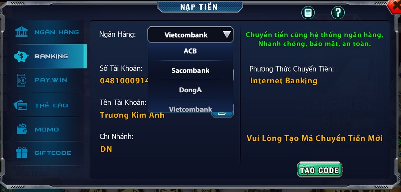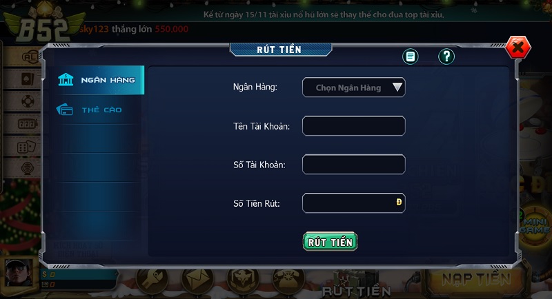 Bạn chọn phương thức nào thì nhấp chọn và đưa thông tin cần thiết cho cổng game như tài khoản ngân hàng hay nhà mạng muốn giao dịch. Cổng game nhận thông tin và thực hiện chi trả theo quy định.