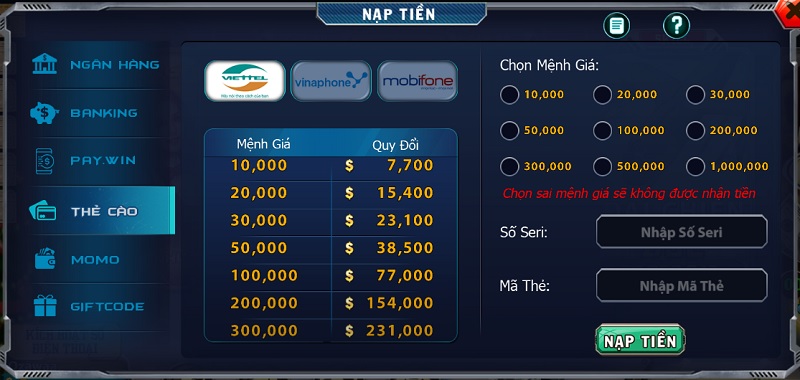 Nạp tiền qua thẻ cào: tại B52 Club hỗ trợ 3 nhà mạng lớn nhất trong nước như Mobiphone, Viettel và Vinaphone.
