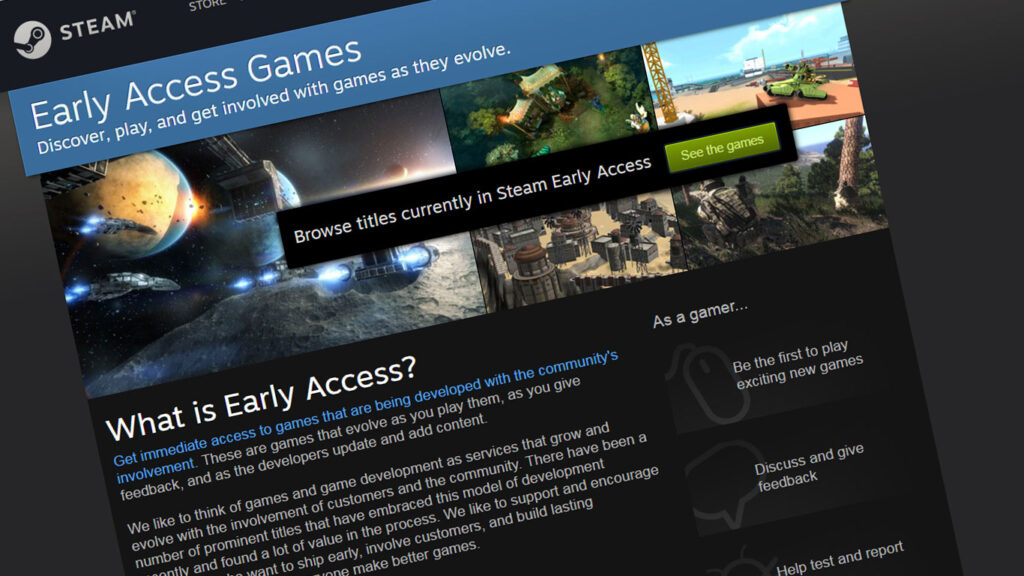 Được ra mắt lần đầu tiên trên hệ thống Steam vào ngày 20/03/2013 với số lượng chỉ 12 game. Early access là phương thức phát hành game mới khá đặc biệt khi chúng cho phép các nhà sản xuất game tung ra bản “chưa hoàn thành chính thức” (nhưng phải đảm bảo rằng trải nghiệm trong game có thể chơi được). Việc này nhằm mục đích thu thập ý kiến đóng góp của game thủ để giúp game trở nên hoàn thiện hơn.