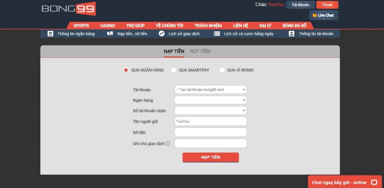 Hướng dẫn nạp tiền tại nhà cái Bong99
