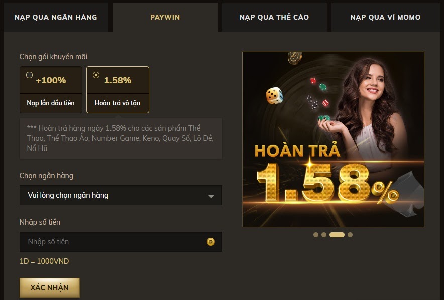 Với phương pháp nạp tiền qua Momo, nhà cái Oxbet hỗ trợ anh em hai gói khuyến mãi là +100% nạp lần đầu và hoàn trả vô tận 1.58%