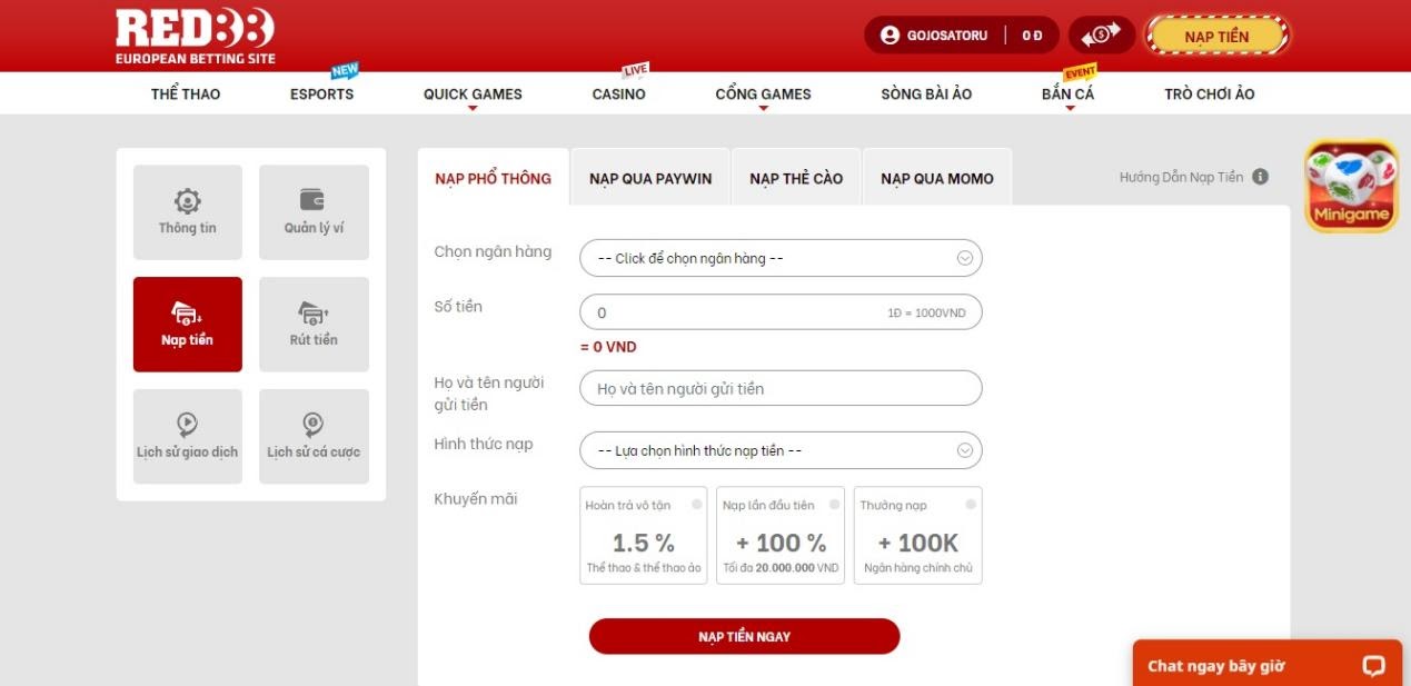 Nhà cái Red88 có một nền tảng thân thiện để hỗ trợ người chơi trong các giao dịch. Anh em có thể thực hiện nạp tiền vào tài khoản của mình tại nhà cái Red88 để bắt đầu trải nghiệm. Cụ thể, anh em có thể thực hiện theo các cách như sau.