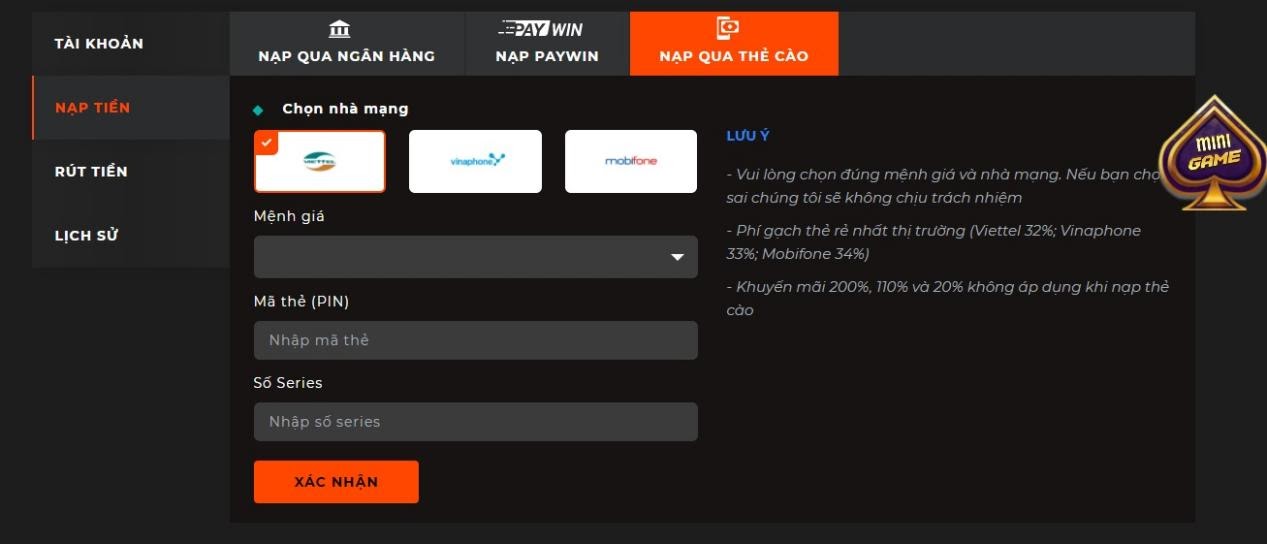 Anh em lưu ý phải nhập đúng mệnh giá và nhà mạng vì nếu anh em nhập sai nhà cái sẽ không chịu trách nhiệm.
