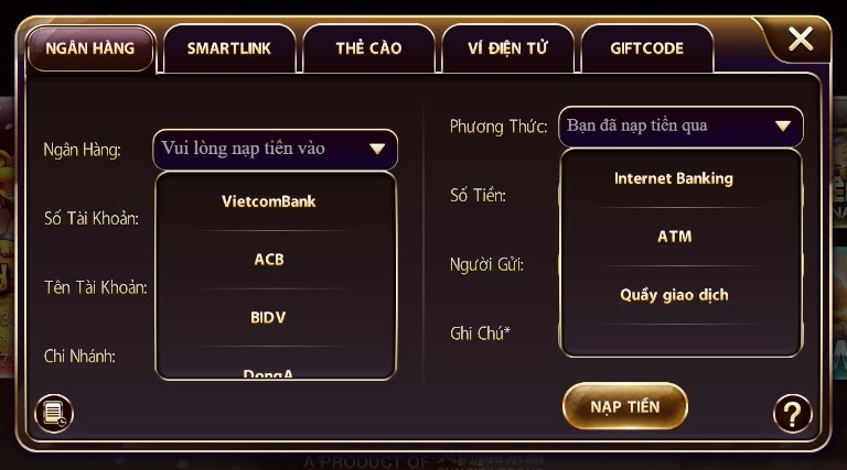 Các anh em sau khi lựa chọn phương thức nạp tiền thì thực hiện điền chính xác thông tin và chọn đúng ngân hàng thực hiện giao dịch để tiến hành nạp tiền.