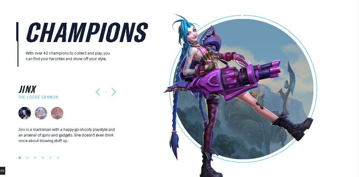 Jinx là một tay thiện xạ với lối chơi bắn súng vui vẻ và một kho súng và đồ dùng. Cô ấy thậm chí không nghĩ đến việc thổi tung mọi thứ.