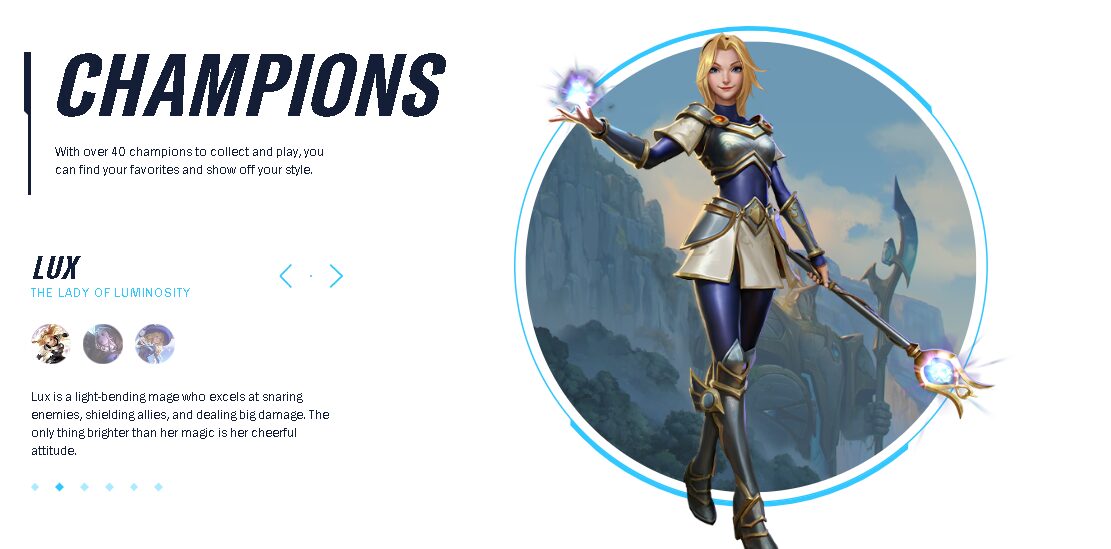 Lux là một pháp sư sử dụng pháp thuật ánh sáng, có khả năng cấu rỉa kẻ địch, che chắn cho đồng đội và gây sát thương lớn. Điều duy nhất sáng hơn ma thuật của cô ấy là thái độ vui vẻ của cô ấy.