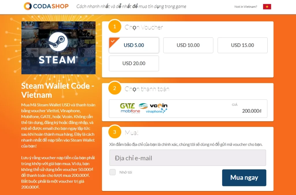 Trang codeshop.com sẽ có 4 mệnh giá tiền thẻ Steam là: 5 USD, 10 USD, 15 USD và 20 USD. Tuy nhiên, bạn chỉ mua được theo 3 mệnh giá đầu mà thôi. Lý do chính là ở Việt Nam chưa có thẻ cào điện thoại nào đáp ứng đủ mệnh giá 20 USD hoặc chưa được hỗ trợ.