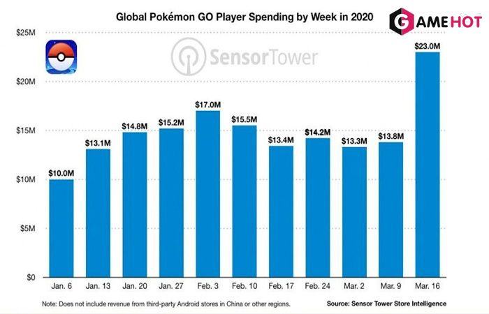 Như bạn có thể thấy từ biểu đồ SensorTower bên dưới, biểu đồ thu nhập hàng tuần trong năm nay trên tất cả các cửa hàng ứng dụng chính thức, Pokémon Go đã có một sự gia tăng đáng kể thu nhập trong tuần bắt đầu vào ngày 16 tháng 3, ngay giữa những lần khóa rộng rãi xung quanh quả địa cầu.